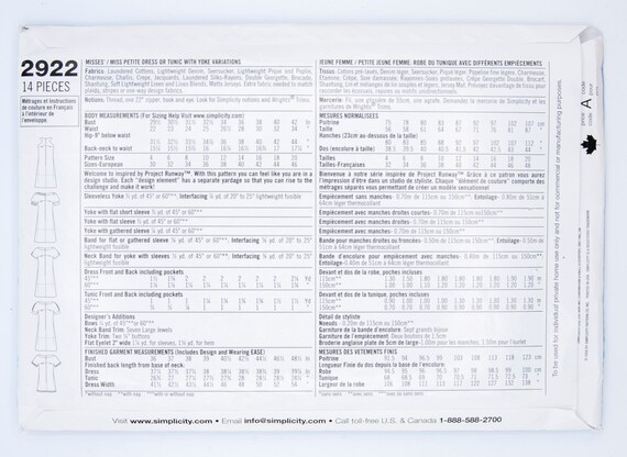 Simplicity Sewing Pattern 2922 Misses Dress Tunic Etsy